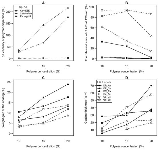 The viscosity of polymer dispersion increases in the order: Acryl-EZE® < Cellacefate < Eudragit® S, especially at two higher polymer concentrations (see Figure 7A). Furthermore, a significant increase in viscosity with the polymer concentration was corroborated. A meager but statistically significant viscosity increase was found for Acryl-EZE®, while for Cellacefate and Eudragit® S, a well recognizable rise was observed. Primarily, a higher polymer concentration (15.0 or 20.0%) in the Cellacefate and Eudragit® S samples increases the viscosity. An increase in the released amount of API for hard gelatin capsules was detected in the order: Cellacefate < Eudragit® S < Acryl-EZE® (see Figure 8B). Samples DR_Ce and DR_Eu capsules differ from all other samples. At 120 min of the dissolution time, these batches have a significant lag time in all polymer concentration levels. Furthermore, a smaller amount of API at 120 min for higher polymer concentration was observed, especially for samples DR_Ac and Ge_Ce. Therefore, the higher amount of API in hard gelatin capsules than in DRcapsTM capsules is unquestionable. In capsule coating, the polymer concentration was evaluated as the dominant effect. The direct relationship between the polymer concentration and coating gain and thickness is visible (see Figure 7C,D). However, the increase in coating thickness is less noticeable than in coating gain. When comparing the coating gain/thickness depending on the capsule type, observable differences between the two groups (DRcapsTM > hard gelatin capsules) were identified. A high difference in coating gain was found, especially for samples Eudragit® S 15.0% and 20.0%. Polymer type also proved to be a statistically significant parameter, but there is also a considerable effect of interactions; the dependencies are more complex because they differ according to the capsule type and polymer concentration. The highest values of coating gain were reached for the samples DR_Eu15, DR_Eu20, DR_Ac15, and DR_Ac20. The coating of the most increased thickness was detected in the samples DR_Ce20; Ge_Ac15, and Ge_Ac20.