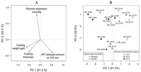 The PCA verified the conclusions mentioned above and provided insight into the main trends in the data structure. The resulting PCA model’s first two principal components described 83.7% of total variability together. Graphical representations of PCA have been created: a loadings plot (see Figure 8A) and a scores plot (see Figure 8B). There is a considerable variation in the monitored properties of coating dispersions and capsules with different formulation parameters settings (see Figure 8B). Polymer type’s contribution to the data set’s variability is evident. In the scores plot (see Figure 8B), the clustering of the samples based on the polymer type is observable in this arrangement: Acryl-EZE® on the bottom, Cellacefate slightly above the center of the coordinate system, and Eudragit® S at the top. In the corresponding bottom-up direction in the loadings plot (see Figure 8A), the effect of the polymer dispersion viscosity is dominant. A considerable difference between the Acryl-EZE® samples and capsules with other polymer types can be observed, as the corresponding points in the scores plot are far from each other. The low viscosity of the Acryl-EZE® dispersion caused this difference. The polymer concentration increases in the direction from right to left (see Figure 8B), which corresponds to the increase in the weight gain of the coating, coating thickness, and a decrease in the released amount of API at 120 min (see Figure 8A). Depending on the capsule type, the grouping of objects showed that the DRcapsTM specimens are more towards the upper left quadrant. In contrast, hard gelatin capsules occupy the space in the lower right direction. In the loadings plot (see Figure 8A), the influence on the released amount of API corresponds to this direction, so DRcapsTM capsules have a lower amount of released API at 120 min than hard gelatin samples.