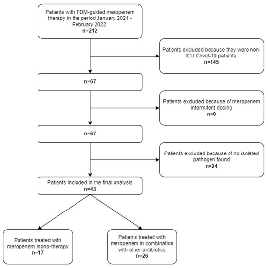 In the study period, a total of 212 critically ill patients who underwent TDM-guided meropenem in the IRCSS Azienda Ospedaliero-Universitaria di Bologna were screened. Among them, 67 were admitted to the COVID ICU owing to acute respiratory distress syndrome caused by severe COVID-19 pneumonia. Finally, forty-three patients had documented Gram-negative superinfections and were included in the study (Figure 1).