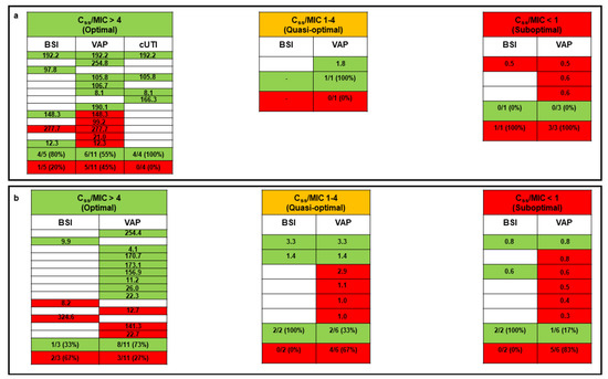 Relationship between pharmacokinetic/pharmacodynamic target attainment (expressed as the average Css/MIC ratio) and microbiological outcome for critically ill COVID-19 patients treated with CI meropenem in monotherapy (panel a) or combination therapy (panel b). Green box, microbiological eradication; red box, microbiological failure; white box, absence of specific type of infection. Each row corresponds to a single patient. The Css/MIC ratio is shown for each patient and defined as optimal if ≥4, quasi-optimal if between 1 and 4, and suboptimal if <1. BSI: bloodstream infection; Css: meropenem average steady-state concentrations; cUTI: complicated urinary tract infection; MIC: minimum inhibitory concentration; VAP: ventilator-associated pneumonia.