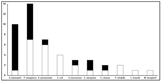 Microbiological outcome according to specific Gram-negative isolates. The Y-axis refers to the total number of clinical isolates for each Gram-negative pathogen described on the X-axis. The white part of each bar refers to the number of microbiological eradications, whereas the black part refers to the number of microbiological failures.