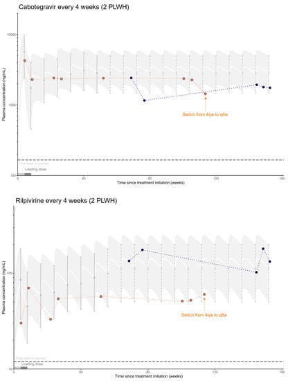 As these are preliminary results from the implementation of LAI-CAB/RPV in Switzerland, only limited data are available at this time. As described above, physicians are at present selecting PLWH who have been consistently adherent to antiretroviral therapy. In addition, the organization, staff, and infrastructure are currently evolving to accommodate the new paradigm represented by these novel approaches. These issues limit, to some extent, the ability to enroll patients at this time. We ultimately aim at including 200–300 PLWH over the next two years, with at least five samples collected per person, thus reaching a total of more than 1000 blood samples. Our translational research collaboration encompasses state-of-the-art mass spectrometry assays, access to institutional genetic platforms, prospective capture of PK, pharmacodynamic, genetic, metabolic markers and clinical data, modeling and simulation capabilities, and clinical expertise in TDM. This setting, therefore, offers a unique opportunity for contributing to the short- and long-term optimization of LAI-ARTs at the individual patient level.