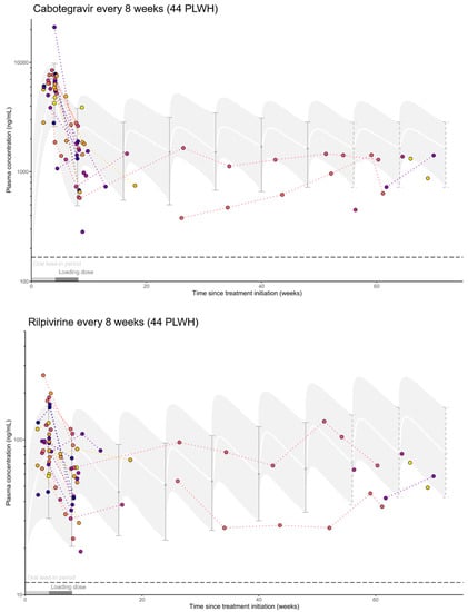 - Aouri, M.; Barcelo, C.; Guidi, M.; Rotger, M.; Cavassini, M.; Hizrel, C.; Buclin, T.; Decosterd, L.A.; Csajka, C.; Swiss, H.I.V. Cohort Study. Population pharmacokinetics and pharmacogenetics analysis of rilpivirine in HIV-1-infected individuals. Antimicrob. Agents Chemother. 2017, 61, e00899-16. [Google Scholar] [CrossRef]