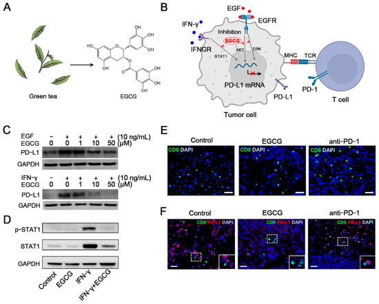 Schematic of EGCG for cancer immunotherapy. (A) EGCG is the active compound derived from green tea. (B) Schematic of the mechanisms of EGCG for the inhibition of the PD-1/PD-L1 axis. (C) Downregulation of epidermal growth factor (EGF) and IFN-γ-induced PD-L1 protein in Lu99 cells after EGCG treatment. (D) Downregulation of p-STAT1 and STAT1 in B16F10 cells after EGCG treatment. (E) Immunofluorescence images of tumor tissue sections stained with CD8 (green) and DAPI (blue). (F) Immunofluorescence images of tumor tissue sections stained with CD8 (green), PD-L1 (red), and DAPI (blue). Reprinted with permission from Ref. [90]. Copyright 2018, copyright MDPI. Reprinted with permission from ref. [91]. Copyright 2021, copyright MDPI.