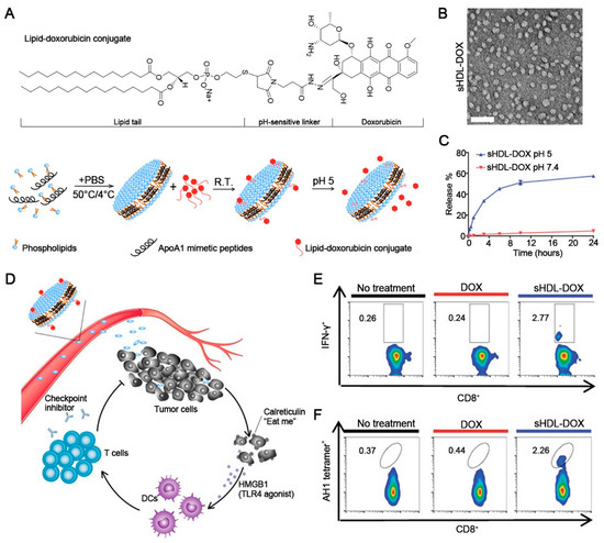 While the hydrophobic core of HDLs provides enough reservoirs for encapsulation of hydrophobic drugs, the amphiphilic shell provides anchoring sites for amphiphilic drugs or can be covalently modified with drugs on the phospholipids or apolipoproteins, thus enabling HDLs to adapt to different drugs with physicochemical properties. Chemo-immunotherapy represents a powerful weapon in the fight against cancer by co-delivery of chemotherapeutics and immunoadjuvants, which can induce potent ICD at tumor sites in a safe manner. Han et al. prepared biomimetic HDLs by using the thin-film dispersion method and mixed them with AS1411 aptamer-CpG fused sequence-conjugated DSPE (Apt-CpG-DSPE) to achieve surface anchoring, and DOX was intercalated into the reservoir of nucleotides for the construction of immune HDL nano drugs [120]. Though the biomimetic HDL NPs reconstituted in vitro function as an alternative with similar characteristics to the native one, they are still considered impossible to fully replicate the structural characteristics and biological functions of native HDLs. Hence, the same assembly strategy also applies to native HDLs that are extracted from Cohn’s F-IV [121]. The HDLs co-loaded with DOX and immunoadjuvants could specifically target tumor cells through recognition of surface scavenger receptor class B type I (SR-BI), followed by internalization of CpG-DOX into tumor cells, DOX-induced TAAs release, and CpG-triggered antigen presentation by DCs, as well as potent anti-tumor T cell response. The limited source and complex extraction process are the two major issues that need to be considered when using native HDLs. It is also noteworthy that the expression of HDL-specific receptors varies among cancer cell types, which might be one of the potential factors of HDL-mediated intratumoral delivery. In addition, synthetic mimetic peptides that retain structural similarities of prototype apolipoproteins possess the advantages of easy synthesis, low cost, and functional modification, compared to apolipoproteins [122]. Kuai et al. prepared HDL-like nanodiscs composed of apolipoprotein A-I mimetic peptides and phospholipids and incubated the nanodiscs with lipid-DOX to construct sHDL-DOX with an ultrasmall size of ~10 nm (Figure 4A,B), in which the DOX molecule was conjugated to the phospholipid through a pH-sensitive linker that specifically broke and released DOX under acidic conditions (pH 5) (Figure 4C) [123]. The ultrasmall particle size and extended pharmacokinetics facilitated the intratumoral penetration of sHDL-DOX, which then triggered the ICD of cancer cells for the initiation of the immunologic cascade (Figure 4D), leading to an upregulated “eat me” signal and enhanced potent responses of CD8+ T cells (IFN-γ + CD8+ and AH1-specific CD8+ T cells) (Figure 4E,F). Combination therapy with anti-PD-1 plus DOX-carrying nanodiscs resulted in complete tumor regression in 80 to 88% of murine tumor models, revealing the effectiveness of sHDL-DOX. Recent studies on tumor lipid metabolism indicate that cancer cells require large amounts of lipids and cholesterols for proliferation or other activities. This might be beneficial for efficient HDL-mediated intratumoral delivery. Besides, due to HDLs’ native regulation of lipid metabolism, HDLs might serve as a potential carrier for remodeling the lymphocyte immune dysfunction caused by abnormal lipid metabolism in the tumor microenvironment.