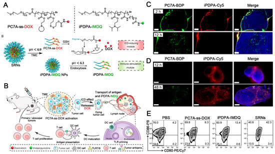 The multifunctionalization of polymers facilitates the development of multifunctional micelle. The introduction of targeted fragments on the surface of micelles promotes the uptake of target cells or adhesion on leukocytes to achieve leukocyte-hitchhiking delivery for a higher accumulation in tumor tissues [136,137]. To achieve programmed drug release that acts on different targets, tumor-microenvironment-responsive micelles have been developed for natural compound delivery and TIME reprogramming [138,139,140]. For example, a pH/redox cascade-responsive micelle has been constructed that can shrink sizes and convert to a positive charge in responding to weak acidity in tumor tissues, resulting in enhanced tumor penetration and endocytosis followed by the release of Cur and NLG919 (an immune checkpoint inhibitor for IDO) in redox-rich cytoplasm [141]. Based on the different acidity characteristics of the tumor extracellular microenvironment (approximately pH 6.5) and lysosomal environment (approximately pH 5.5), dual-pH-responsive micelles were reported to achieve sequential release of two drugs acting on extracellular (anti-PD-1 mAbs to block PD-1 in T cells) and intracellular (Cur to promote the tumor infiltration of T cells by inhibiting NF-κB pathway), respectively [142]. Wang et al. also constructed dual-pH-responsive micelles (SRNs) for sequential delivery of two different prodrugs (ICD inducer and DC stimulator) (Figure 5A) [143]. SRNs accumulated in both tumor tissues and lymph nodes tissues (Figure 5C,D), in which NPs responded to signals of TME (pH < 6.9 and high-level glutathione (GSH)) to release DOX early in tumor tissues to trigger ICD, while the remaining NPs were phagocytized by DCs in sentinel lymph nodes tissues and released imidazoquinolines to promote DC maturation (Figure 5B,E), providing a potential micelle-based candidate to advance synergistic cancer chemo-immunotherapy. This sequential delivery strategy conforms to the sequence of initiation and boost of the cancer-immunity cycle in theory. In this regard, it might be meaningful for better amplification of anti-tumor immune response.