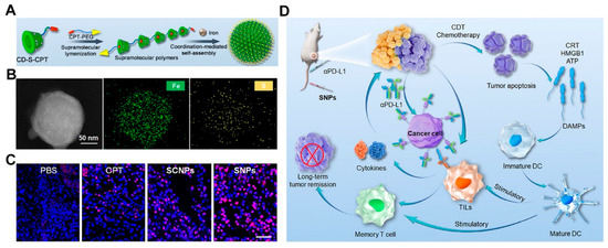 Schematic of SNPs for cancer immunotherapy. (A) Schematic of the assembly of the supramolecular monomer (CD-S-CPT) and construction of SNPs. (B) The elemental mapping of SNPs. (C) Representative images of TUNEL staining of the tumor tissues after treatment with different preparations. (D) Schematic of the mechanism of SNPs-based combination therapy with ICI to elicit anti-tumor immunity. Reprinted with permission from Ref. [146]. Copyright 2022, copyright Wiley-VCH.