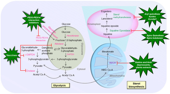 Potential drug targets and repurposed drugs against glycolysis and sterol biosynthesis pathways of Leishmania parasite.