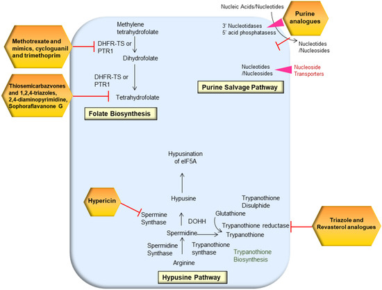 - Ilari, A.; Fiorillo, A.; Genovese, I.; Colotti, G. Polyamine-trypanothione pathway: An update. Futur. Med. Chem. 2017, 9, 61–77. [Google Scholar] [CrossRef] [PubMed]