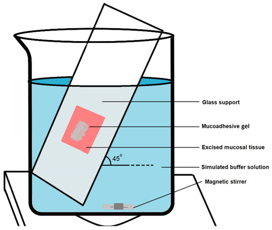 Experimental conditions were set up to estimate the ex vivo mucoadhesive time of buccal gel formulations, as reported in literature [23]. For that, an inclined glass slide at an approximate angle of 45° was placed in a beaker upon which a freshly excised rabbit’s buccal mucosa was fixed with the help of acrylate adhesive (Figure 2). The whole set up was immersed in a PBS maintained to pH 6.8 with a volume of 800 mL. Before immersing the slide, 3 g of mucoadhesive buccal gel was applied on an area of 4 cm2 to the mucosal surface and was left undisturbed for almost 20 s to develop mucoadhesion. The slide was then immersed gently and the recorded time for which the gel either eroded or detached from the mucosal surface was ranked as ET for each respective formulation [16]. The experiment was repeated thrice.