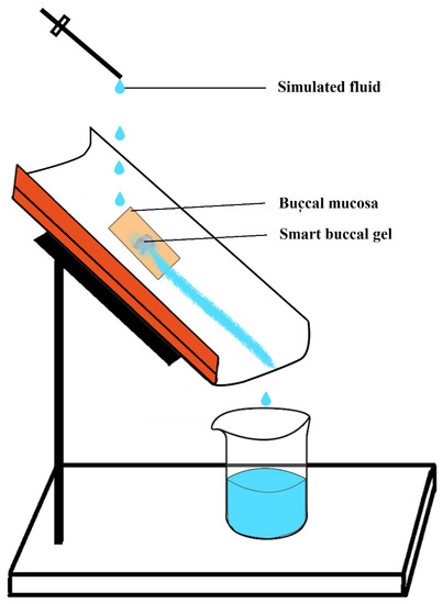 The FT for the prepared buccal gels was also evaluated using a modified apparatus [24]. Briefly, half of the polyvinyl chloride pipe was inclined at an approximate angle of 60° on which a freshly excised rabbit’s buccal mucosa was adhered using acrylate gum. Afterwards, mucoadhesive smart gel was placed on the surface of mucosa and was kept undisturbed for 20 s to develop mucoadhesion (Figure 3). From the above side of the inclined setup, a consistent flow rate of 1 mL/min of PBS adjusted to pH 6.8 was added drop wise on the gels. The temperature of PBS was kept at 37.5 °C. The time in which the gel completely wiped off the mucosal surface was considered as the average FT for each respective formulation when the procedure was repeated thrice [15].
