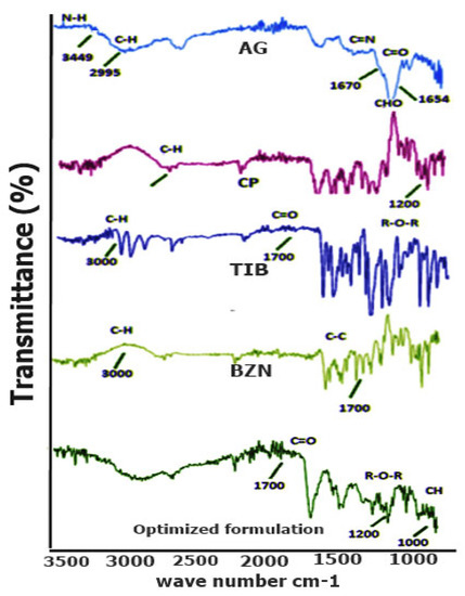 FTIR analysis was performed on the pure samples of TIB, BZN, CP, AG, and of the physical mixture as used in the optimized formulation. Concisely, infrared spectra in the range of 4000–400 cm−1 were obtained by operating a Bruker (Billerica, MA, USA™) spectrophotometer (run by OPUS®, Alpharetta, GA, USA) using platinum-ATR with four scans in the transmission mode [7].