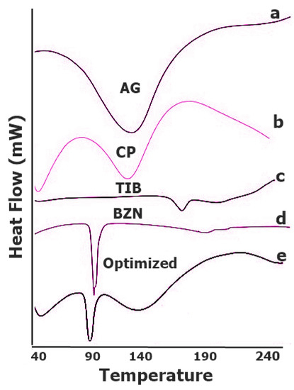 In order to detect any sort of interaction among the components of the formulations, DSC analysis was performed on pure drugs, polymers, and their physical mixture (Figure 6). As depicted, the melting point of BZN drug was identified by an endothermic event corresponded to the temperature of 89.52 °C. The powder of the drug started melting at this temperature but a sharp depression was achieved at 92.15 °C, which is similar to the reported work [35]. For TIB, melting of the pure drug was confirmed as an endothermic peak depression around 161.40 °C which also corresponded to recent findings [17]. For Carbopol, the characteristic endothermic peak was found to be similar as reported in the literature [36,37]. Similarly, the pure AG started melting around 88–93 °C, depicting the amorphous nature of the polymer [38]. No additional or unusual peaks were found in the DSC of optimized formulation (T2). While the sharp endothermic event observed in the optimized formulation approximately around 90 °C was associated with the BZN drug. This showed that the integrity of the drug was maintained in the mucoadhesive dosage form. However, the enthalpy of the heat value was reduced for BZN.