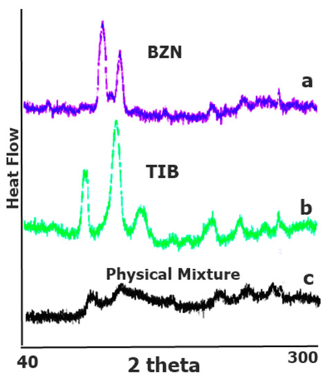 PXRD pattern of (a) BZN, (b) TIB, and (c) the physical mixture.