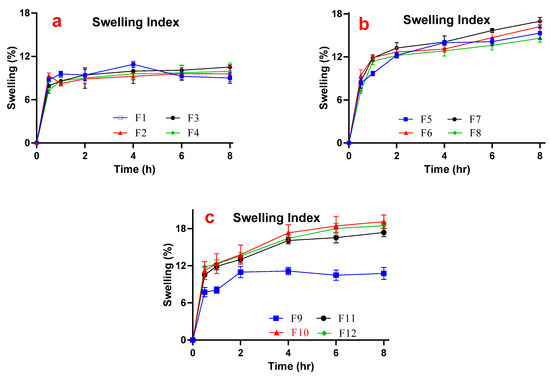 Swelling trend of formulations containing (a) AG alone (F1–F4), (b) Carbopol alone (F5–F8), and (c) AG-CP composite (F9–F12).