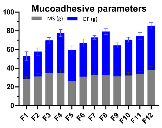 3.2.7. Ex Vivo Mucoadhesive Strength (MS)