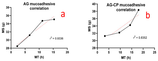 Adhesion to the mucosal membrane is a definite property of mucoadhesive polymers which ensures smooth attachment of the dosage form for designed period [47]. The adhesion found in smart mucoadhesive buccal gels composites supported the mucoadhesion of the prepared formulations ex vivo and in vivo. The MS evaluation on rabbit’s buccal mucosa revealed that an increasing concentration of polymeric gels was associated with increasing MS [16]. In comparing, the MS of AG alone (F1–F4) gels was found superior to formulations containing CP alone (F5–F8). However, the MS of polymer composite gel (F9–F12) was further superior to its respective F1–F4. Highest mucoadhesive strength of 38.35 g was found with F12 (Figure 9) The MS values of respective gels were superior to its respective gel formulations prepared in the smart mucoadhesive buccal gels composites which could possibly be due to concentration-based 3D swelling of gel polymer composite thus enhancing its adhesion [13].