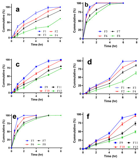 Swelling is a property that can be linked with the release of a drug [44]. This is due to the fact that the extent of influx of water for definite swelling will also govern the rate at which the drugs will efflux from dosage form, showing that the extent of drug release can be adjusted depending upon the nature and concentration of swellable polymer. In the sustained release gel scaffold study, the gel swellability pattern of formulated gels was almost similar to smart mucoadhesive buccal gels composites and an overall increasing trend was observed for all of the gel formulations. In contrary to smart mucoadhesive buccal gels composites study, the magnitude of swellability was not proportionally increased when the corresponding concentration of polymers in gel was increased. This meant that there was a definite swelling capacity for polymers, after which the swelling was not further increased even when the concentration of polymer was raised. In gels containing AG alone, maximum SI of 10.89% after 4 h was observed for formulation F1. It can also be observed from Figure 8a that formulations F1–F4 swelled to a pre-equilibrium level after 0.5 h. The findings are supported from agarose-carbopol based hydrogels synthesis in a study for tissue engineering [45]. After a sharp initial swelling at 1 h, the formulations swelled very slightly till 8 h [46]. Afterwards, the formulations did not exhibit a steep rise in swellability over time rather just a slow increasing value was seen compared to F5-F8 formulations. It can also be observed that swelling was better when AG alone was formulated in F1 (0.5% w/v) and F2 (0.75% w/v) as compared to F3 and F4.