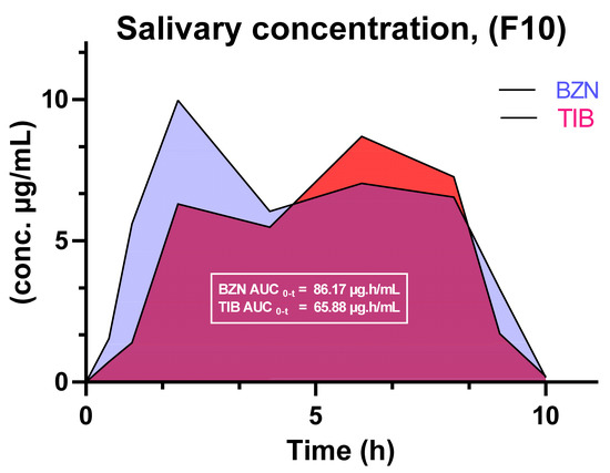 Similarly, the pharmacokinetic estimation of drugs in the saliva of human volunteers through non-compartmental approach showed that Cmax of BZN (9.97 µg/mL) was achieved early at 2 h, whereas the corresponding value of TIB (8.69 µg/mL) was obtained around 6 h. The values were comparatively higher as reported in our previous studies to deliver drug for better salivary concentration [15,17]. The Cmax of BZN was higher than that of TIB while both drugs showed 2 plateau regions (Figure 13) which could be attributed due to the clearance of drugs by rinsing action of saliva. The elimination rate constant for BZN and TIB were 0.24 and 0.71 h−1, respectively. With a dose of 15 mg each for each drug from the optimized formulation F10, the AUC0-t for BZN and TIB were 59.28 and 55.75 µg·h/mL, respectively. When AUCt–∞ was assessed for both drugs, it was found that the contribution of BZN was significant from the last time interval to infinity, while not for TIB. So, additional time interval of 10 h was also evaluated for drugs in order to fulfill the significance of AUC from time t10h to infinity. The cumulative AUC 0–∞ for BZN and TIB were 86.17 and 65.88 µg·h/mL, respectively (Table 5).