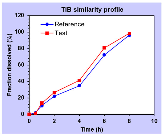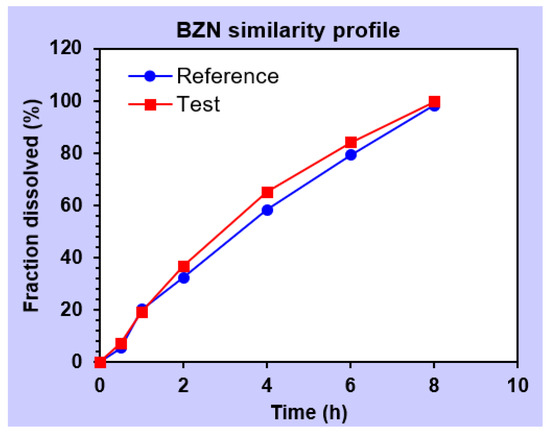 During storage, the optimized formulation (F10) was evaluated for some physicochemical tests and drug contents, as well as the release of BZN and TIB. It was observed that there was no notable change in physical appearance, which was in accordance with the smart mucoadhesive buccal gels composites. At the end of stated stability time, F10 did not show any signs of precipitation, color change, translucency or separation of water from the gel phase. Parameters such as pH and mucoadhesion was not significantly different from the formulated gels. Dissolution studies (Figure 14 and Figure 15) were also carried out to evaluate significant difference in similarity and dissimilarity factor (Table 6) which depicted that the respective values of similarity and dissimilarity factors were within the acceptable limits [17]. For BZN, the corresponding values of f1 and f2 were 7.0 and 70.72 whereas it was 10.79 and 66.19 for TIB, respectively.