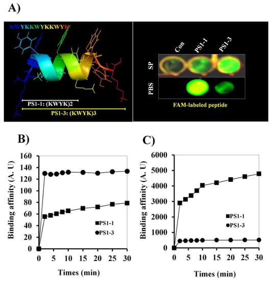 The binding affinity of the PS1-1 and PS1-3 peptides to C. albicans was assessed. Cells were grown overnight in YPD medium at 37 °C. Aliquots were suspended in PBS containing 10% YPD medium at 5 × 105 cells/mL. FAM-labeled PS1-1 and PS1-3 peptides at one-half the MFC were added to the mixture and incubated for 1 min. C. albicans cells were centrifuged and washed to remove unbound peptides. The fluorescence of the cells was measured using FOBI (Cellgentek, Daejeon, Korea) at different times (2, 4, 6, 8, 10, 15, 20, 25, and 30 min) with a SpectraMas M5 ELISA microplate reader (excitation wavelength: 485 nm, emission wavelength: 538 nm) [11].