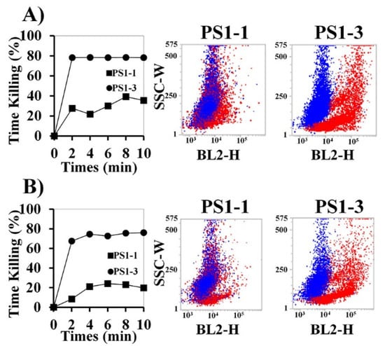 Inhibitory effects of PS1-1 and PS1-3 peptides against C. albicans cells. Time-kill kinetics of PS1-1 and PS1-3 peptides with C. albicans (5 × 105 cells/mL) within SP (A) and PBS buffer (B). The cells were stained with propidium iodide (PI) and recorded per each 2 min interval by FACS. Blue and red dots present non-treated and treated cells, respectively. All values represent three individual experiments.