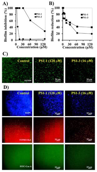 Anti-biofilm activity of PS1-1 and PS1-3. Biofilm inhibition (A) and reduction (B) in C. albicans CCARM 14007 cells strain by treating PS1-1 and PS1-3 peptides. Fluorescence microscope images of PS1-1 (128 μM)- and PS1-3 (16 μM)-treated cells indicated biofilm inhibition (C) and biofilm reduction activity (D).