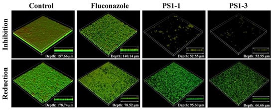 Image analysis of C. albicans CCARM 14007 strain using confocal laser scanning microscopy (CLSM). The biofilm inhibition and reduction on C. albicans CCARM 14007 in the absence (control) or presence of Fluconazole, PS1-1, and PS1-3. Biofilm formation by C. albicans CCARM 14007 was stained using FUN1 dye. All values represent three individual experiments.