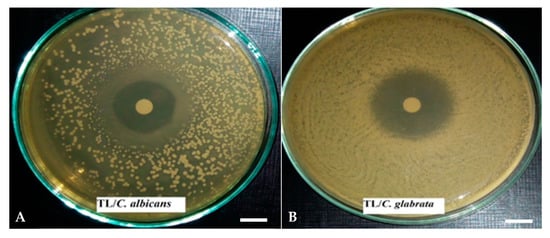Examples of the antimicrobial activity of plant essential oils by the disc diffusion method. (A) Effect of Thymus leptobotrys on Candida albicans. (B) Effect of Thymus leptobotrys on Candida glabrata. Bars correspond to 1 cm.