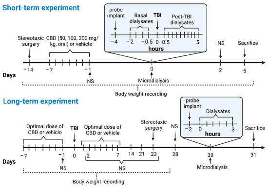 Timeline of the short- and long-term experimental design to determine the effects of oral administration of CBD on severe traumatic brain injury (TBI). Throughout the protocols, the body weight and sensorimotor function of the animals were registered. For the short-term experiment, a guide cannula was implanted in the cerebral cortex. Seven days after surgery, CBD or vehicle was administered every 24 h for 7 days. Twenty-four hours after the last CBD administration, a microdialysis experiment and TBI induction were performed. Five days after TBI, animals were sacrificed and perfused for histological analyses. For the long-term experiment, rats received the optimal dose of CBD or vehicle every 24 h for 7 days. TBI was induced 24 h after the last administration. One group received CBD treatment for an additional 7 days after TBI. On day 23 post-TBI, a guide cannula was implanted in the cerebral cortex, and microdialysis was performed 1 week later. Animals were sacrificed and perfused on day 31 post-TBI for histological analysis. The figure was created using BioRender.com.