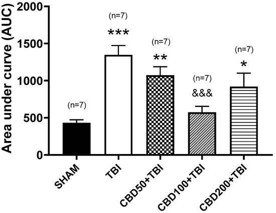 Representation of the glutamate release during the entire process of the microdialysis experiments of the short-term experiment through the area under curve (AUC). The TBI group showed an increased overall glutamate release. Experimental groups pretreated with CBD showed lower AUC values when compared with the TBI group. This effect was more evident in the group pretreated with 100 mg/kg. * p < 0.05 vs. SHAM group, ** p < 0.01 vs. SHAM group, *** p < 0.01 vs. SHAM group; &&& p < 0.001 vs. TBI group (F(4,30) = 9.906, p < 0.0001, one-way ANOVA). CBD, cannabidiol; TBI, traumatic brain injury.