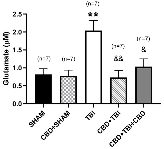 Effects of CBD administration on glutamate concentration at day 30 post-TBI. The SHAM and CBD + SHAM groups showed a similar glutamate concentration. TBI group showed a higher glutamate concentration when compared to the SHAM group. In contrast, CBD + TBI and CBD + TBI + CBD groups showed a glutamate concentration similar to the SHAM group. Values represent the mean ± standard error. ** p < 0.01 vs. SHAM; & p < 0.05 vs. TBI, && p < 0.01 vs. TBI (F(4,30) = 7.055, p = 0.0004, one-way ANOVA). CBD, cannabidiol; TBI, traumatic brain injury.