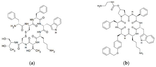 Cyclic structure of octreotide (D-Phe-cyclo[Cys-Phe-D-Trp-Lys-Thr-Cys]-Thr; C49H66N10O10S2) (a) and pasireotide (cyclo[Hyp(N-(2-aminoethyl)carbamate)-Phg-D-Trp-Lys-Tyr(Bn)-Phe ; C58H66N10O9) (b). Formulas were drawn with ChemSketch 2020.1.2. (ACD/Labs, Toronto, ON, Canada).