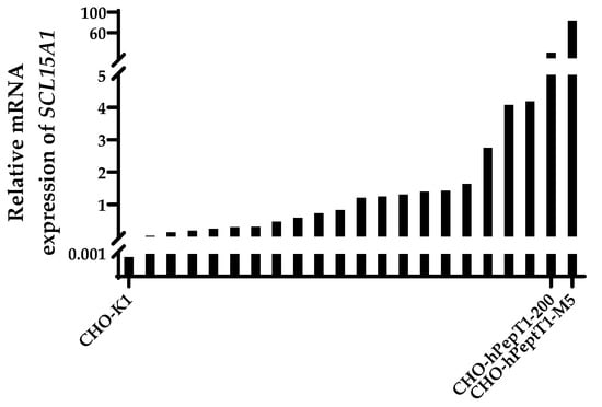 Relative mRNA expression of SLC15A1 in CHO-K1 and the CHO-K1 clones after transfection with SLC15A1 and selection. Data were normalised to the reference genes Fkbp1a and Mmadhc. Depicted is the mean of a technical duplicate. The two clones with the highest expression (CHO-hPepT1-200 and CHO-hPepT1-M5) were chosen for further characterisation.