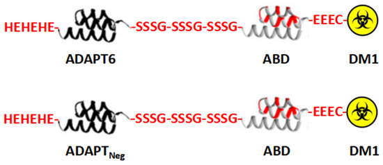 In a previous study, an ADAPT6-based drug conjugate was designed for targeted delivery of a cytotoxic drug to HER2-expressing tumor cells [39]. The ADAPT6-ABD-mcDM1 conjugate consists of ADAPT6 as the HER2-targeting domain, an ABD for extension of the half-life in blood circulation for increased bioavailability, and the cytotoxic drug DM1 (Figure 1). ADAPT6-ABD-mcDM1 demonstrated nanomolar affinity to HER2, a reasonably good internalization rate by HER2-expressing cancer cells lines, a specific HER2-dependent toxicity in several cancer cell lines, and the capacity for specific accumulation in HER2-expressing human tumor xenografts in mice.