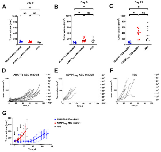 Comparison of tumor volumes in experimental therapy groups (n = 9–10) in BALB/c nu/nu mice bearing SKOV3 xenografts, receiving ADAPT6-ABD-mcDM1, ADAPTNeg-ABD-mcDM1 or PBS (vehicle) (A) at the start of the experiment (day 0), (B) after two treatment cycles (day 9) and (C) after four treatment cycles (day 23). Individual tumor volume growth curves for mice received (D) ADAPT6-ABD-mcDM1, (E) ADAPTNeg-ABD-mcDM1 or (F) PBS (vehicle). The mice were euthanized when the volume of the subcutaneous xenografts exceeded 1000 mm3 (T) or ulcers on the xenografts were observed (U). (G) The average tumor volume (n = 9–10) in mice receiving ADAPT6-ABD-mcDM1, ADAPTNeg-ABD-mcDM1 or PBS (vehicle) once a week for four weeks. The data are presented as an average value ± standard deviation (SD). The curves were drawn until 30–33% of the mice in a group were euthanized. The arrows indicate the days when treatment was administered. NS corresponds to no statistically significant difference (p > 0.05); * corresponds to p < 0.01 (one-way ANOVA with Bonferroni correction).