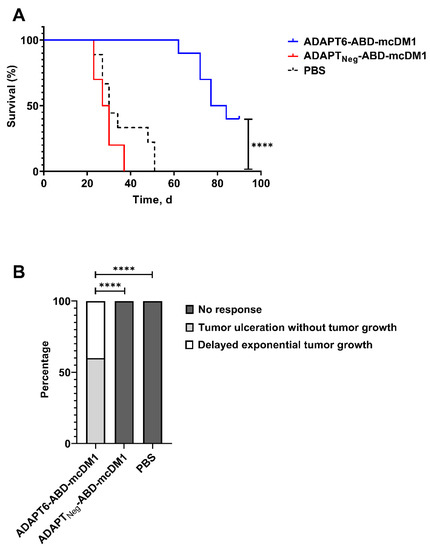 The median survival was significantly (Mantel–Cox log-rank test, p < 0.0001) longer in the ADAPT6-ABD-mcDM1 group (80.5 days) compared to the ADAPTNeg-ABD-mcDM1 group (28.5 days) and to the PBS group (30 days) (Figure 3A). The therapy outcome was significantly (chi–square test, p < 0.0001) better for the ADAPT6-ABD-mcDM1 group than for the ADAPTNeg-ABD-mcDM1 group or the PBS group (Figure 3B).