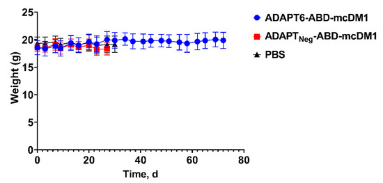 The treatment was well tolerated, with no observable side effects. No tendency for weight loss was observed in the ADAPT6-ABD-mcDM1 group compared to the ADAPTNeg-ABD-mcDM1 group or the PBS group. The differences in average animal weight between the groups were within one standard deviation (Figure 4).