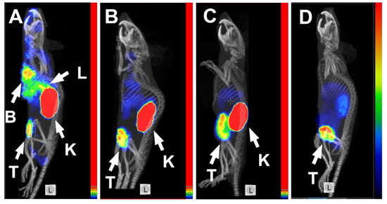 MicroSPECT/CT imaging of HER2-expression in mice from the PBS group using 99mTc(CO)3-ADAPT6-ABD-mcDM1 at (A) 4 h and (B) 24 h p.i., (C) using 99mTc(CO)3-ADAPT6 at 4 h p.i. and (D) using 99mTc-ZHER2:41071 at 4 h p.i. The arrows with the letters “T”, “K”, “L” and “B” point to the tumors, kidneys, liver and blood pool in the heart, respectively. The color scale sidebars show the relative activity and are adjusted to the first red pixel in tumors.