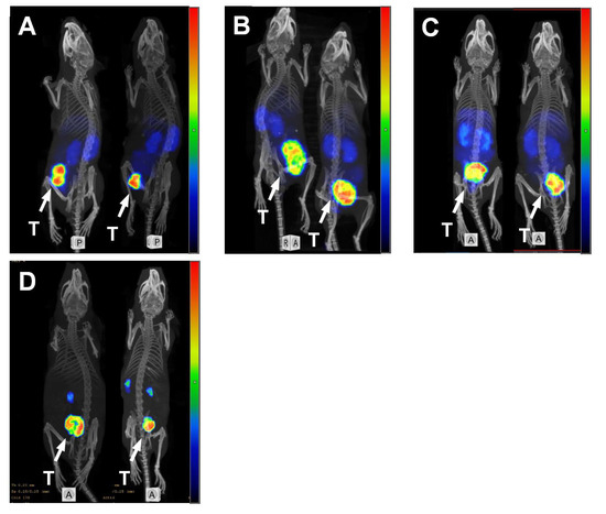 MicroSPECT/CT imaging of HER2-expression using 99mTc-ZHER2:41071 in BALB/c nu/nu mice bearing SKOV3 xenografts. The imaging was performed at days 43 (A), 29 (B), 34 (C) and 77 (D) of the experimental therapy. Two mice from the ADAPT6-ABD-mcDM1 treated group with small tumors at day 43 (A) and day 77 (D), two mice from ADAPTNeg-ABD-mcDM1 treated group at day 29 (B) and two mice from PBS treated group at day 34 (C) with large tumors. The arrow with the letter “T” points to the tumors.