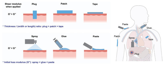 Taking advantage of the dynamic and reversible interactions such as hydrogen bonding, pi-pi stacking, electrostatic interactions, host-guest interactions, hydrophobic effects, and van der Waals interactions [4,5,6], a variety of functional supramolecular adhesive materials have been developed to realize tough bonding on tissues or organs. In contrast to traditional adhesives, these adhesive materials show different physical forms such as glue, tape, and patch, and versatile delivery approaches such as spray, paste, and injection (Figure 1) [7], providing versatilities and convenience for their applications. Currently, non-covalent interactions are widely exploited and proved effective in developing supramolecular polymers and polymer composites with desired mechanical strength, interfacial adhesion, and intelligent, responsive properties. These supramolecular adhesive materials are promising for a range of biomedical applications [8].