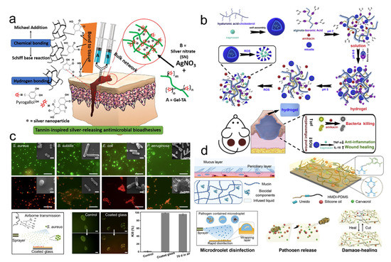 Although antibiotics still play an important role in controlling pathogens’ proliferation, abusing antibiotics could accelerate the resistance to drugs [31,32,37]. To avoid the resistance caused by the abuse of antibiotics, environmentally friendly antimicrobial strategies have been developed. Essential oils derived from plants have been considered green antimicrobial agents due to their suitable biocompatibility, low cost, and broad-spectrum antimicrobial ability [28,38]. Our group recently developed a carvacrol-regulated mucus-inspired adhesive through crosslinking intermolecular hydrogen-bonded polyurea and carvacrol (Figure 2c) [27]. The obtained supramolecular adhesives exhibited suitable transparency, tunable mechanical properties, reusable adhesion behaviors, controlled release, and long-term antimicrobial activity. The content of incorporated carvacrol will cause many variations such as mechanical properties and release behaviors due to the various intensities of hydrogen bonding interactions between supramolecular polymers and essential oils. The adhesive might help address the issues of virus/pathogen-contained aerosols. We then reported another mucus-inspired supramolecular organogel adhesive coating, which could effectively control the pathogen spread by respiratory microdroplets (Figure 2d) [28]. In this supramolecular system, a polyurea scaffold could provide mechanical strength and accommodate different kinds of lubricant oils. The carvacrol could regulate the hydrogen-bonded network and provide antimicrobial functions, and the silicone oil endowed the organogels with self-healable and lubricant properties. The supramolecular organogel coating could adhere to the substrates and provide a wrapping-layer-assisted disinfection mechanism through the released carvacrol. The pathogen-containing microdroplets were spatially wrapped by the lubricant oils, which would increase the release rate of carvacrol for rapid disinfection. Although the biocide-releasing strategy has drawn wide attention and has been frequently used in antimicrobial adhesives, the limited content of antimicrobial agents could hinder the sustained activity of the adhesives, which may require frequent replacement of the adhesives for continuous disinfection [32].