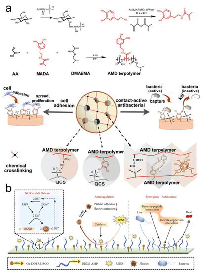 (a) A strong and tough hydrogel adhesive could promote the adhesion of fibroblasts, which was derived from the methacrylamide dopamine. The intrinsic antimicrobial properties originated from the quaternized chitosan molecules. Reproduced with permission [40]. Copyright 2019, John Wiley and Sons. (b) Realization of anticoagulation and synergistic antibacterial properties of Cu-DOTA& surface.