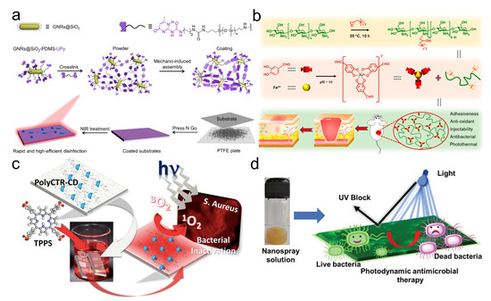 Taking advantage of the UPy-assisted supramolecular interactions, we have developed one supramolecular nanocomposite adhesive coating (Figure 4a) [50]. The adhesive coating was mechanically induced by the assembly of powders, which contained the mixture of the siloxane-modified gold nanorods and siloxane-derived crosslinkers. The nanocomposite adhesive coatings exhibited fast preparation, strong adhesion, high stiffness, rapid disinfection ability, and remarkable disinfection effectiveness over 99.9% to different kinds of multi-drug-resistant bacteria within 6 s near-infrared irradiation (NIR). Liang et al. reported an antimicrobial adhesive hydrogel through a dual-dynamic-bond crosslinked mechanism consisting of ferric iron, protocatechualdehyde, and quaternized chitosan (Figure 4b) [51]. The dynamic properties of catechol-Fe coordination and Schiff base bonds endowed the adhesive with self-healing and on-demand dissolution or removal properties. The quaternized chitosan provided the inherent antimicrobial ability, and the compound of catechol-Fe with NIR properties provided the photo-responsive antimicrobial capability. Despite the photo-induced heating having made significant progress, the generated heat may also damage the local cells and tissues [32]. For adhesives with photodynamic antimicrobial function, the incorporated photosensitizers could transform the light energy into chemical energy to induce the generation of active molecules such as hydroxyl radicals, superoxide, or singlet oxygen for pathogen disinfection. For example, Castriciano et al. reported an antimicrobial scaffold with photosensitizer releasing ability. The scaffold was fabricated from the polypropylene fabrics and loaded with the poly (carboxylic acid)-cyclodextrin/anionic porphyrin through the typical host-guest interactions (Figure 4c) [53]. This method showed a sustained and efficient photodynamic antimicrobial activity to Gram-positive S. aureus and Gram-negative P. aeruginosa. Paul et al. also developed a light-activatable nanospray coating with photodynamic therapy of microbes (Figure 4d) [54]. The sustainable antimicrobial coating from adhesive, UV-resistant, and antimicrobial lignin-integrated abilities of photoluminescence and singlet oxygen generation render the coating promising in phototheranostic applications. Moreover, supramolecular polymers containing photosensitizers usually showed better antimicrobial activity to Gram-positive bacteria than Gram-negative bacteria due to the structural differences in the cell membranes [52,55]. These results demonstrated that the stimuli-responsive properties enabled the adhesive materials to have smart properties.