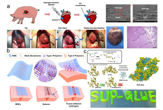 - Zhang, K.; Chen, X.; Xue, Y.; Lin, J.; Liang, X.; Zhang, J.; Zhang, J.; Chen, G.; Cai, C.; Liu, J. Tough Hydrogel Bioadhesives for Sutureless Wound Sealing, Hemostasis and Biointerfaces. Adv. Funct. Mater. 2022, 32, 2111465. [Google Scholar] [CrossRef]