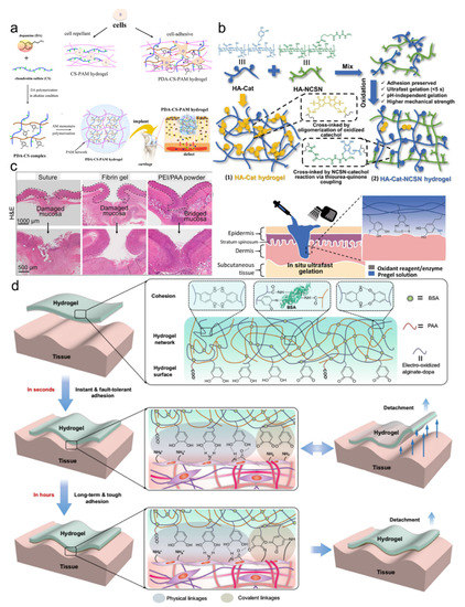 (a) Chondrocyte growth and cartilage regeneration were promoted by a growth-factor-free polydopamine-chondroitin sulfate-polyacrylamide hydrogel. Reproduced with permission [87]. Copyright 2018, American Chemical Society. (b) Schematic illustration of the fabrication process and mechanisms for the adhesion. Reproduced with permission [88]. Copyright 2020, American Association for the Advancement of Science. (c) H&E staining of the gastric wounds treated by different bioadhesives was compared. (d) Schematic illustration of the adhesion mechanism on the tissue surfaces.
