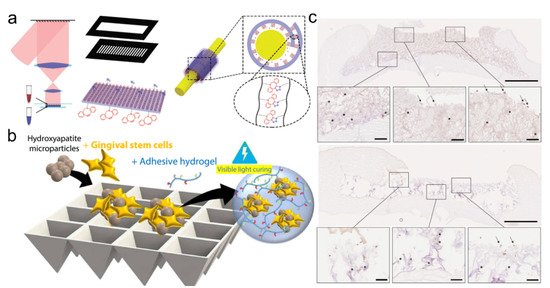 - Hasani-Sadrabadi, M.M.; Sarrion, P.; Pouraghaei, S.; Chau, Y.; Ansari, S.; Li, S.; Aghaloo, T.; Moshaverinia, A. An engineered cell-laden adhesive hydrogel promotes craniofacial bone tissue regeneration in rats. Sci. Transl. Med. 2020, 12, eaay6853. [Google Scholar] [CrossRef]