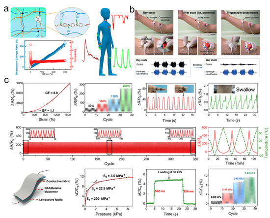 (a) The strain sensor for reliable detection of human activities by a tough and electrically conductive hydrogel, which comprised hydrogen-bonding-crosslinked PANI and P-(AAm-co-HEMA). Reproduced with permission [127]. Copyright 2018, American Chemical Society. (b) The physiological signal EMG was measured through a hydrogel adhesive with tough and reversible adhesion. Reproduced with permission [128]. Copyright 2021, John Wiley and Sons. (c) Multifunctional electronic devices for the detection of strain, pressure, and temperature signals on the human body.