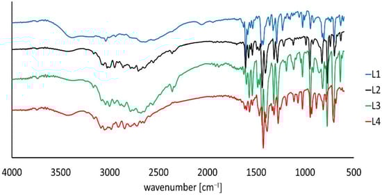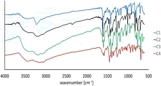 Figure 1 and Figure 2 show the spectra of the free ligands and the corresponding cadmium coordination compounds, respectively. During complexation, the vibrational modes of the free organic N-donors were changed. Comparing the spectra of each appropriate ligand and complex with each other, it can be seen that the fundamental ν(NH) from the imidazole ring, which was present in the organic ligands in the range of 3161–2591 cm−1 was shifted towards higher wavenumbers (3547–2928 cm−1) in coordination compounds C2 and C4, thus showing that the NH group did not participate in binding. However, in the case of compounds C1 and C3, we can say that these bands did not change because of a lack of coordination from the imidazole ring. In the spectra of the uncoordinated donors, the vibrations modes of ν(C=N) and ν(C=C) were visible in the ranges of 1627–1600 and 1483–1390 cm−1, respectively. As a result of the coordination between the metal ion and the ligand, these frequencies shifted towards higher or lower frequencies with the following peaks: for C1, 1622 and 1423 cm−1; for C2, 1629, 1602, 1434, and 1414 cm−1; for C3, 1598, 1450, and 1406 cm−1; for C4, 1584, 1450, and 1395 cm−1. For compounds C1 and C3, we could see hypsochromic effect on ligands L1 and L3, respectively. This is evidence of a different way of coordination in these coordination compounds. For all complexes, moving towards the lower wavelengths, we could observe bands in ranges of 1300–1012 and 910–690 cm−1, corresponding to the β(CH) and γ(CH) modes, respectively. By analyzing the presented spectra, it could be concluded that, in the case of compounds C1 and C3, the coordination took place through the nitrogen atom contained in the pyridine ring and due to the slight interaction of the metal (II) and hydrogen atom coming from the imidazole ring. As for compounds C2 and C4, it was clearly seen that the N-donor ligands were monodentate and coordinated via the nitrogen from the imidazole ring.