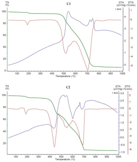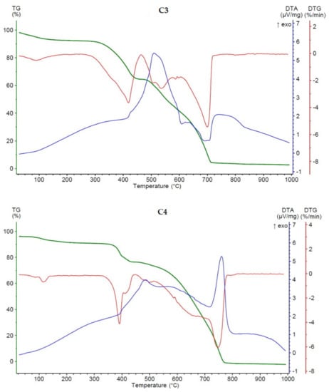 Thermal analyses of the cadmium (II) coordination compounds. TG (green), DTA (blue), and DTG (red) curves for complexes C1, C2, C3, and C4.